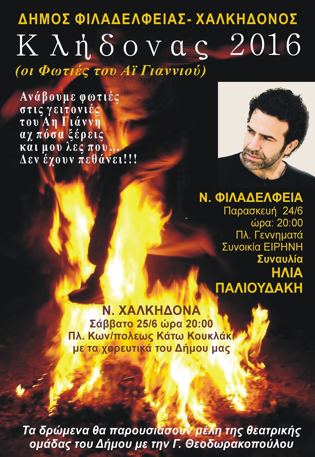 • Την Παρασκευή 24 Ιουνίου ώρα 20.00 στην Πλατεία Γεννηματά, (συνοικία Ειρήνη ), στην Ν. Φιλαδέλφεια θα πραγματοποιηθεί συναυλία με τον Ηλία Παλιουδάκη.